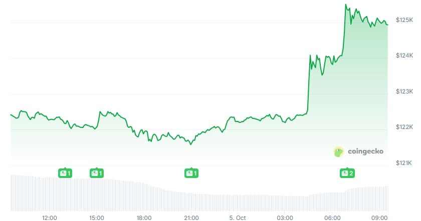 In zowel dollars als euro’s heeft bitcoin in het afgelopen uur een nieuwe all-time high gevestigd. Het nieuwe record komt uit op 125.560 dollar en 106.970 euro.