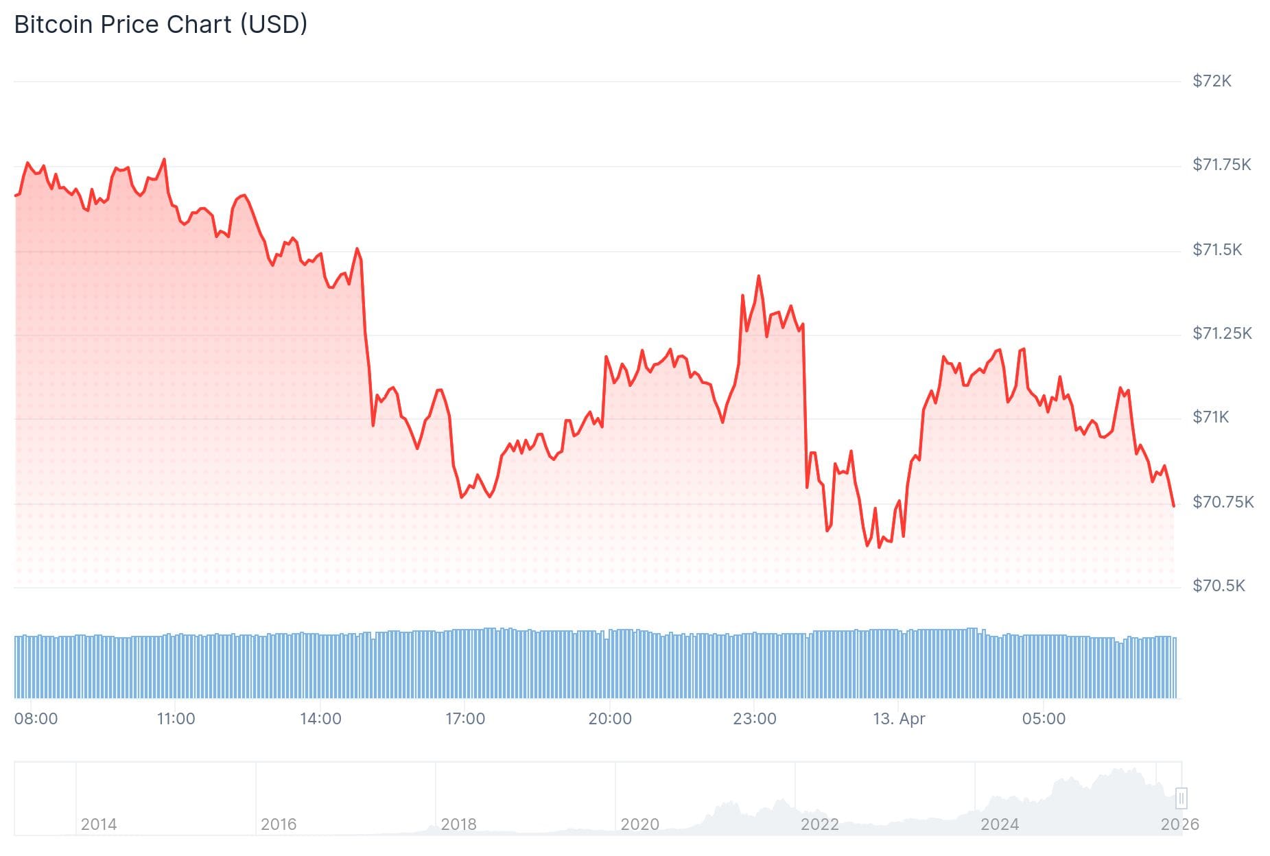 In een uur tijd daalde bitcoin van ongeveer 73.000 dollar naar 71.700 dollar. Daar heeft de koers een pauze genomen om vervolgens in de middag weer verder te dalen.