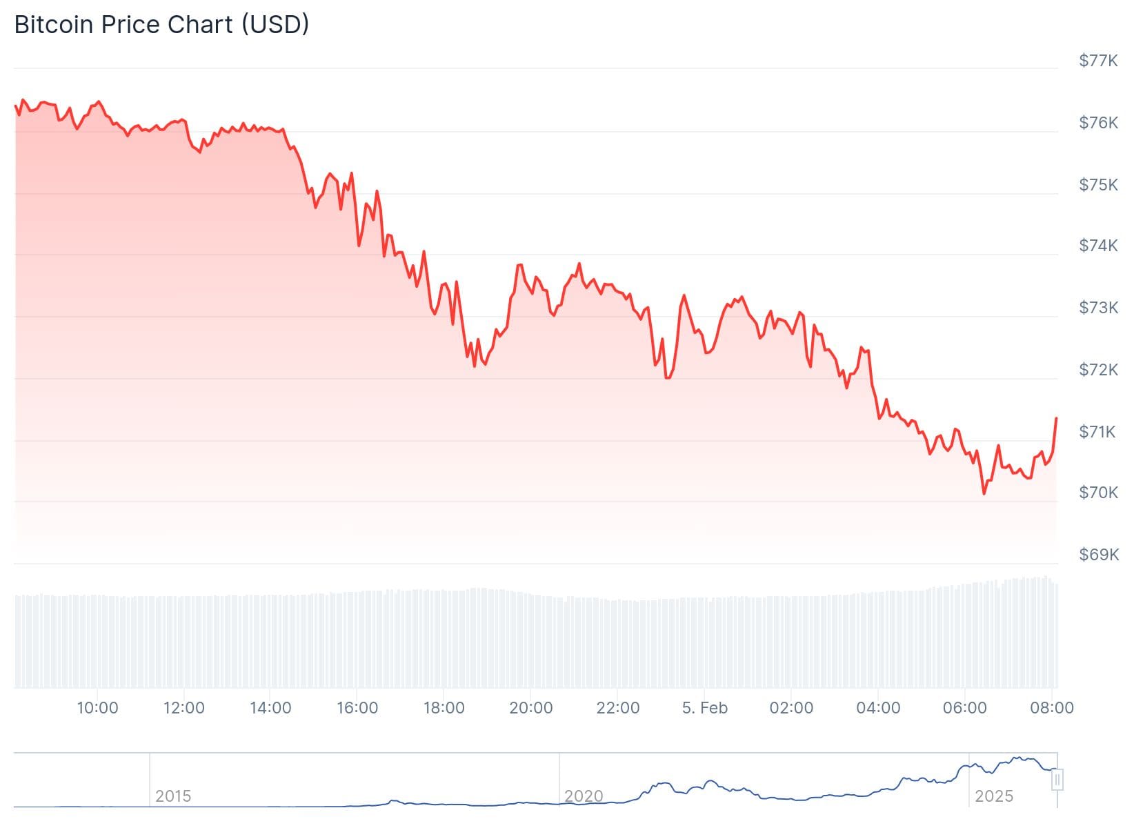 De afgelopen week heeft de bitcoin koers bijna iedere dag een duikvlucht genomen. Dit keer is de grootste cryptomunt wel 6.000 dollar goedkoper geworden. De koers is namelijk van 76.000 dollar naar 70.000 gedaald. Een pijnlijk verlies van bijna 8 procent.