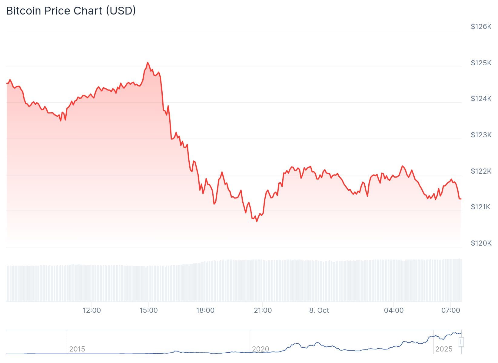 Daarna werd de daling in iets lagere versnelling voortgezet. Rond 20:30 uur werd een bodem gevonden van 120.660 dollar. Dat is 3,5 procent lager dan de 125.000 dollar van eerder op de dag. En het is 4,5 procent lager dan het record dat gisteravond is gevestigd.