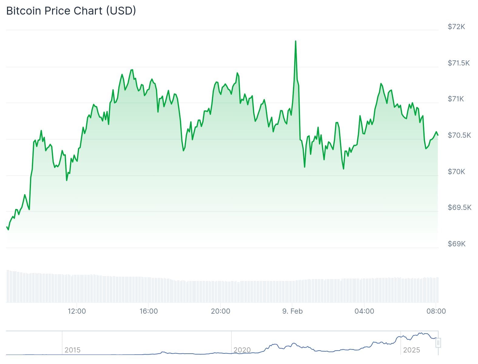 Daar moest het zaterdag even van bijkomen. De koers daalde tot een dieptepunt van 67.300 dollar, maar herstelde dezelfde dag nog tot boven de 69.000 dollar. Gisteren steeg het verder naar 72.200 dollar, maar de dag (en week) werd uiteindelijk net boven de 70.000 dollar afgesloten.