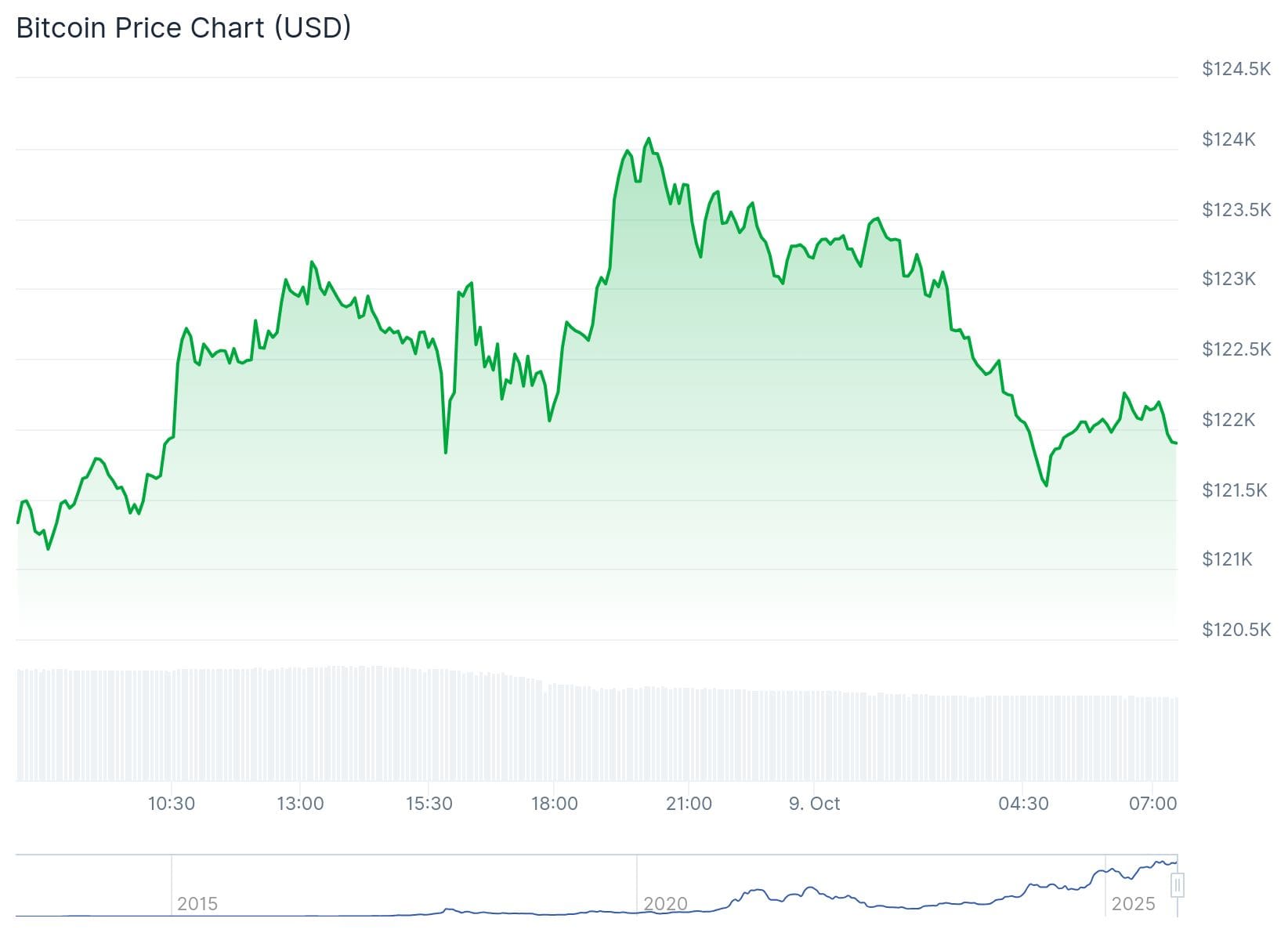 Voorlopig is 121.600 dollar het laagste punt. Dat is ongeveer 2 procent lager dan de piek van 124.000 dollar van gisteren.