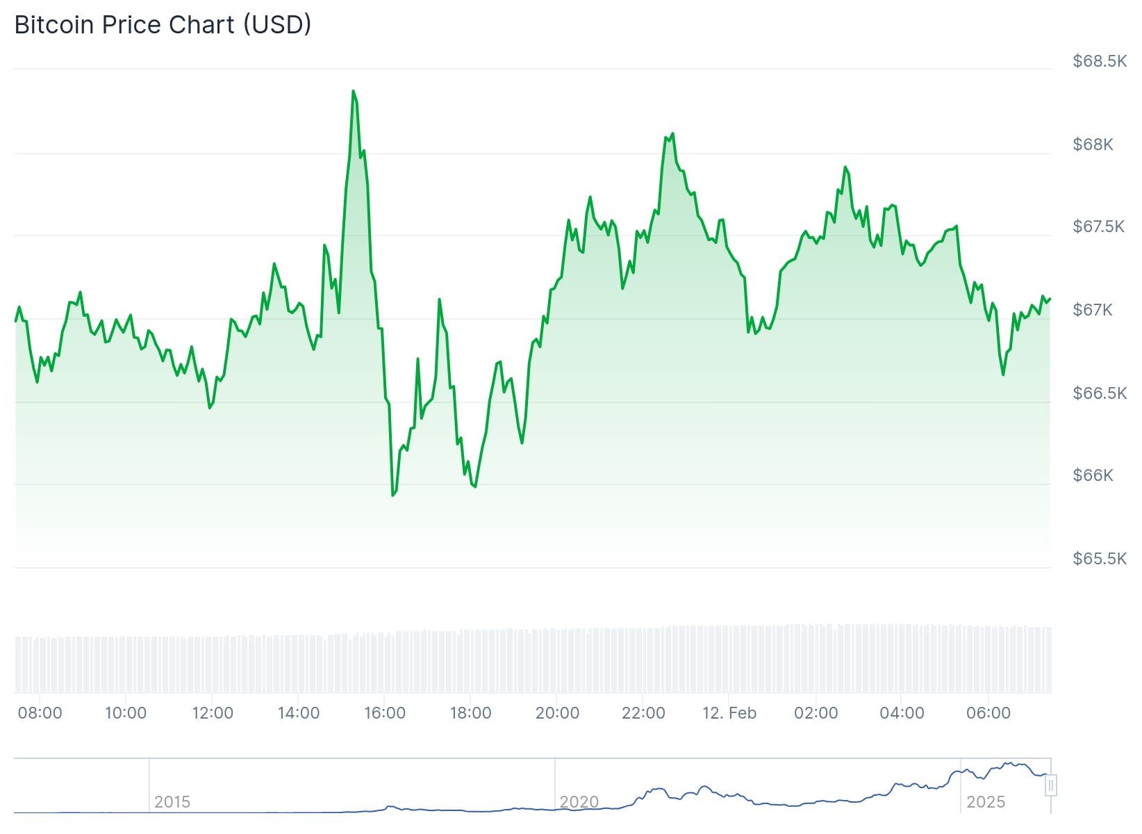 ‘s Avonds herstelde bitcoin weer en het positieve is dat de dag is afgesloten boven de 67.000 dollar. Maar de weg is nog lang tot die 72.000 dollar.