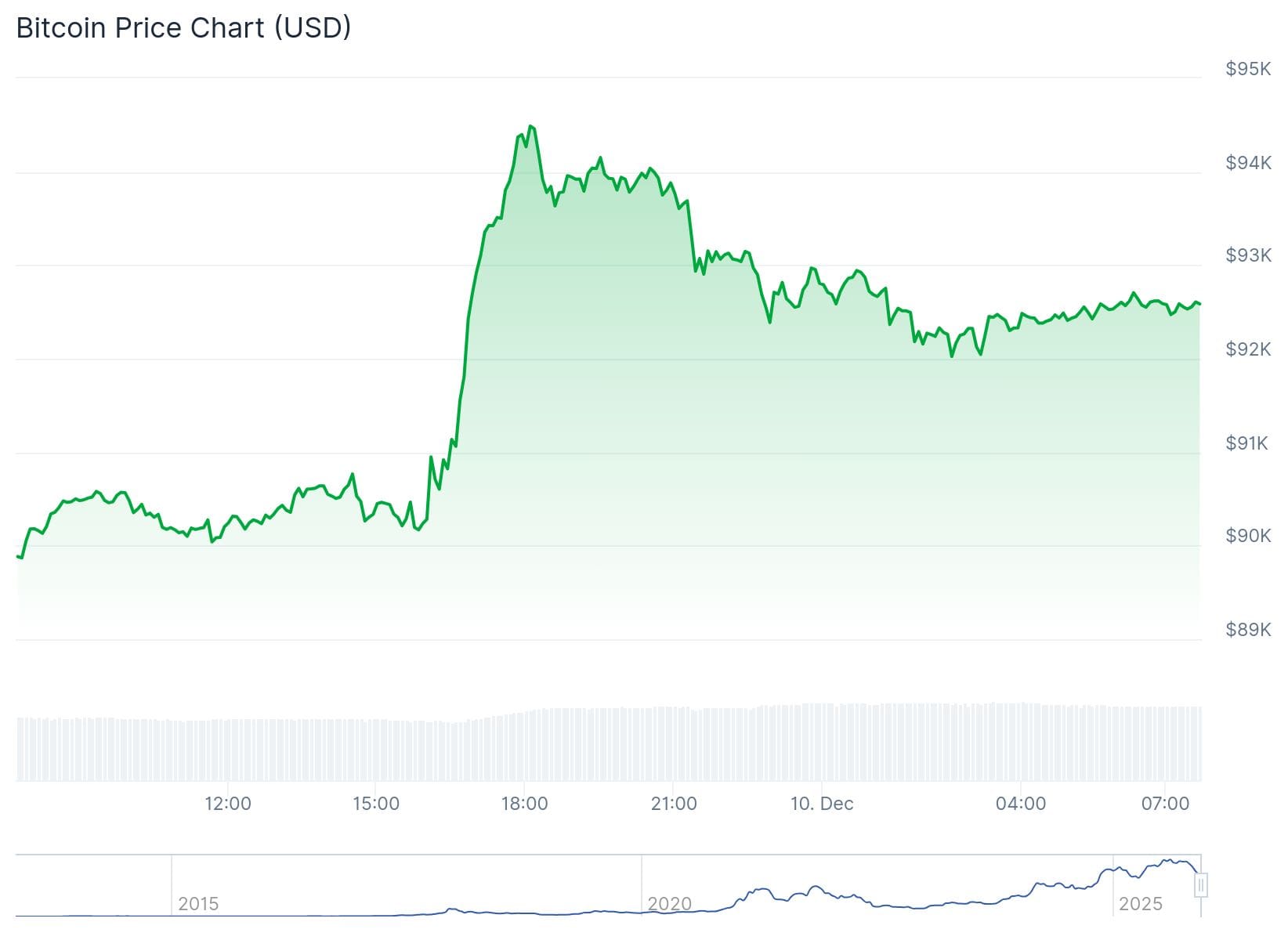 In ongeveer twee uur tijd ging de bitcoin koers van 90.200 dollar naar een piek van 94.600 dollar. Een stijging van bijna 5 procent. 94.600 dollar is het hoogste niveau sinds 17 november, wat meer dan drie weken geleden is.