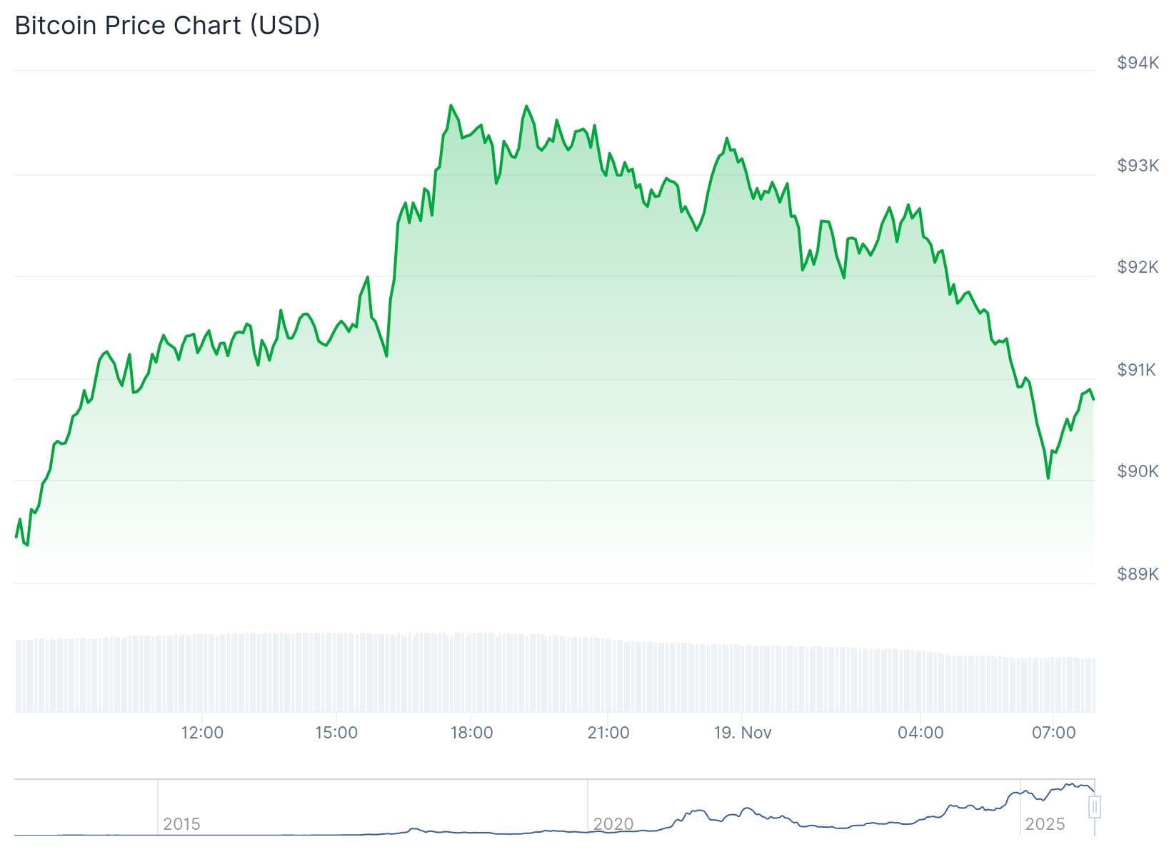 In de avond zakte het steeds verder weg, maar uiteindelijk hebben de verkopers vannacht pas echt hun slag geslagen. In een paar uur tijd daalde bitcoin van 92.700 dollar naar 90.000 dollar en nu staat het bijna op 91.000 dollar.
