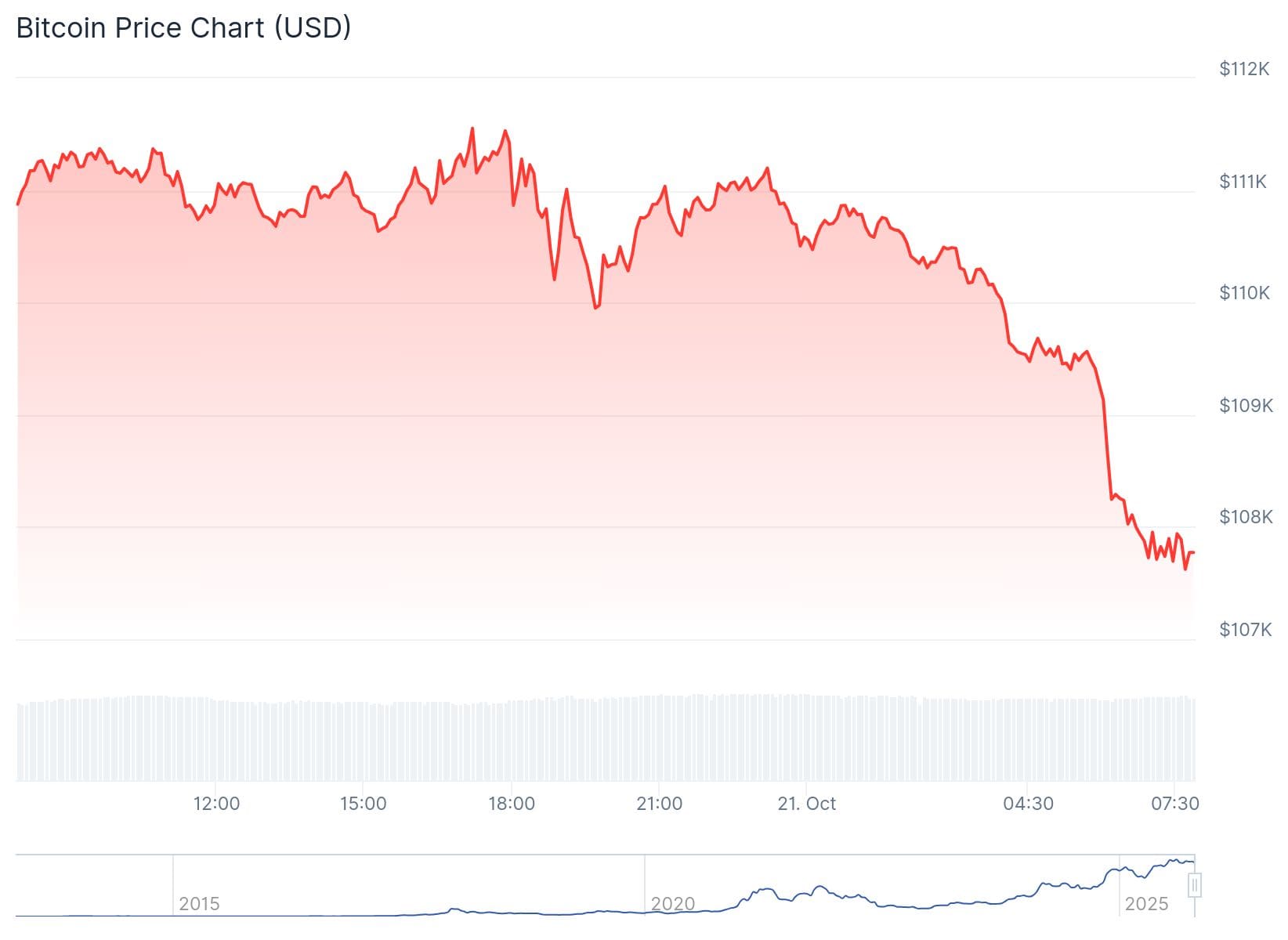 Het lukte maar niet om echt door te pakken. Hoe later het werd, hoe meer moeite de koers had om boven de 111.000 dollar te blijven. Rond middernacht dook de koers hieronder en een paar uur later moest ook de 110.000 dollar zich overgeven. Pas rond 06:00 uur vond de grootste val plaats met een crash tot onder de 108.000 dollar.
