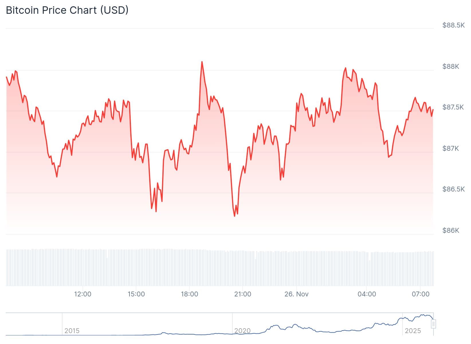 Bitcoin heeft tot twee keer toe voor iets meer dan 86.000 dollar op de markt gestaan. Op die momenten stond de koers wel 2,3 procent lager dan de openingskoers van 88.200 dollar.