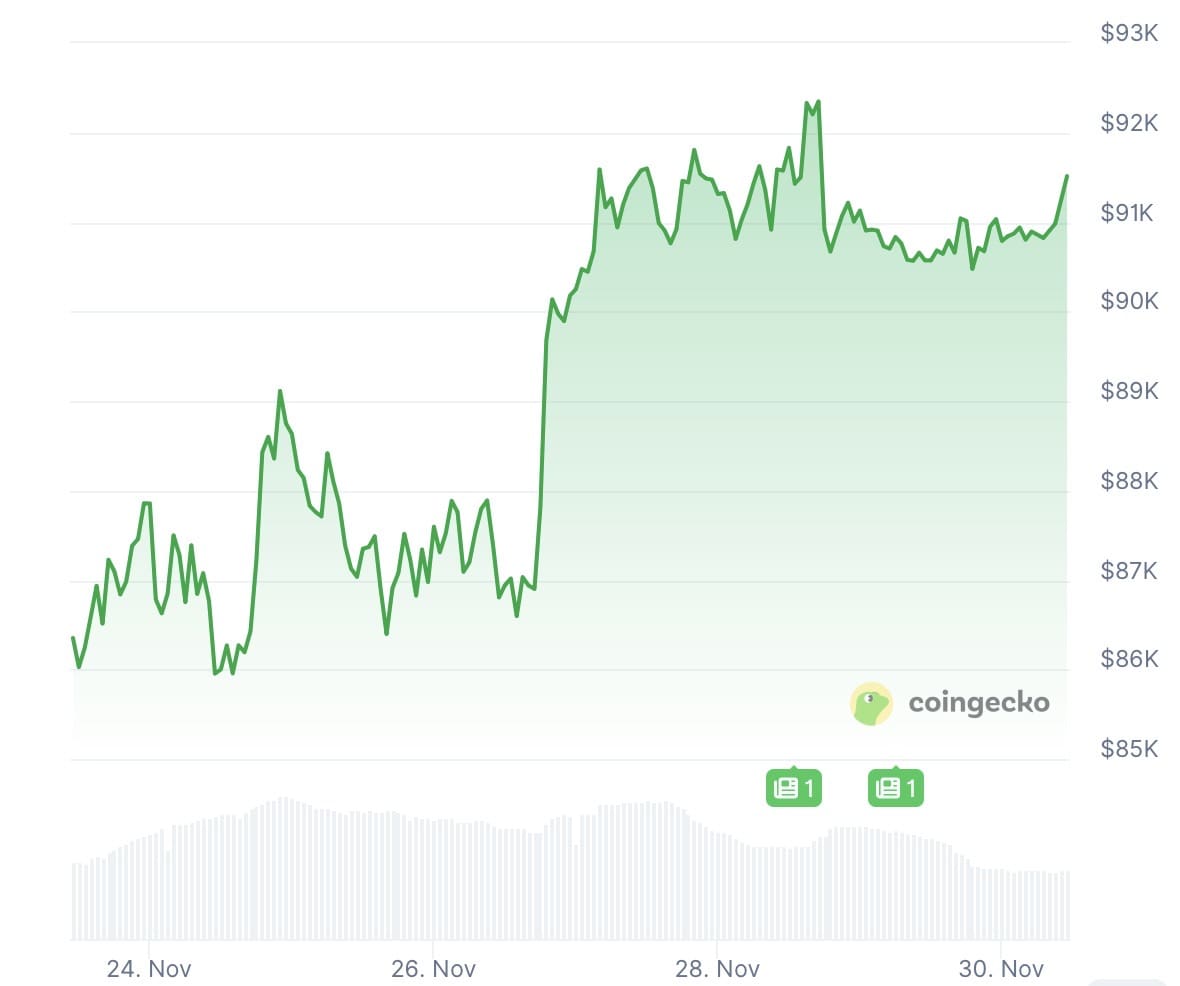 De koers van bitcoin is in november met ongeveer 17 procent gedaald, maar vond precies een week geleden ondersteuning rond 85.000 dollar.