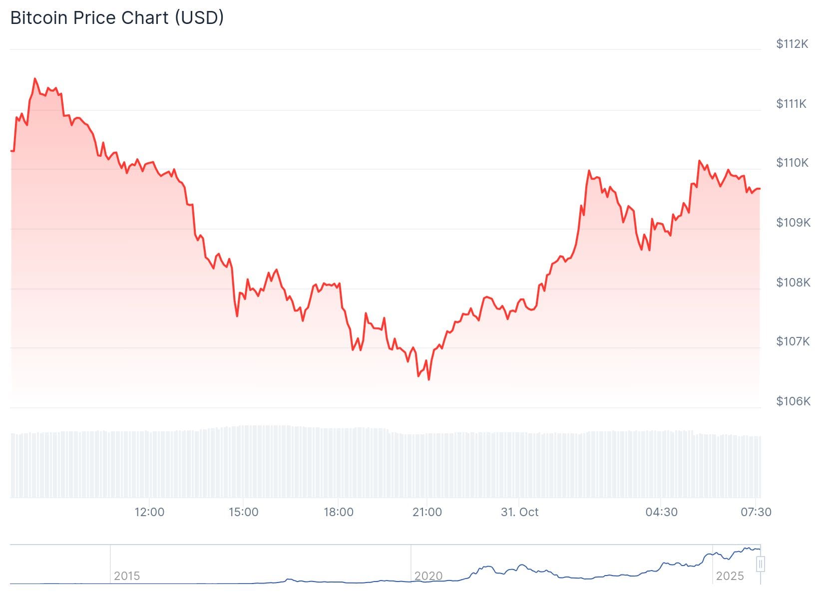 Dan hebben we het over een totale daling van 4,6 procent. Gelukkig is bitcoin daarna weer hersteld tot 110.000 dollar, waar het nu net onder hangt.