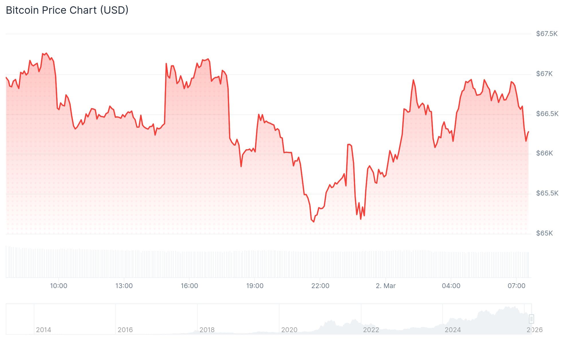 De bitcoin koers daalde in no-time van zo’n 66.000 dollar naar 63.000 dollar. Maar het verlies werd ook weer razendsnel goedgemaakt. Bitcoin steeg zelfs naar 68.000 dollar en de dag werd op 67.000 dollar afgesloten.