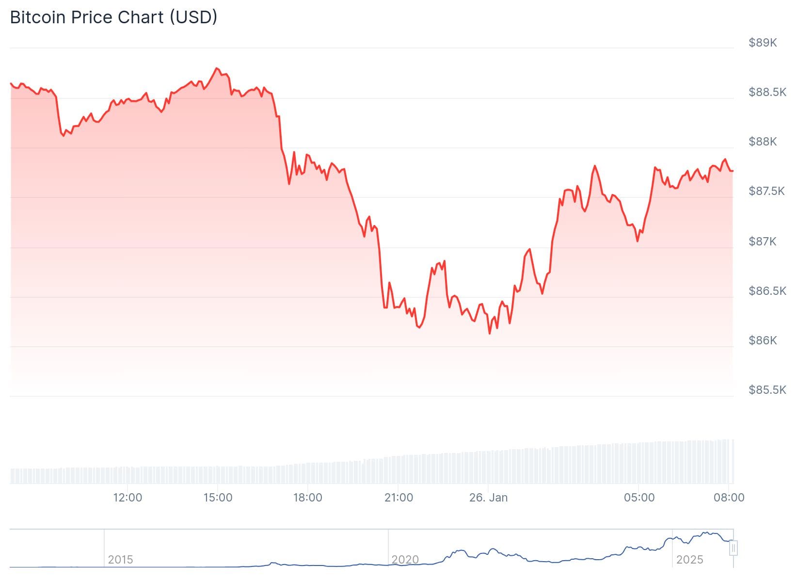 Op het moment van schrijven staat de bitcoin koers op crypto exchange OKX op 87.840 dollar. Op de Nederlandse cryptobeurs Bitvavo komt de BTC prijs in euro daarmee uit op 74.089. Ten opzichte van 24 uur geleden staat BTC 1,84 procent in de min.