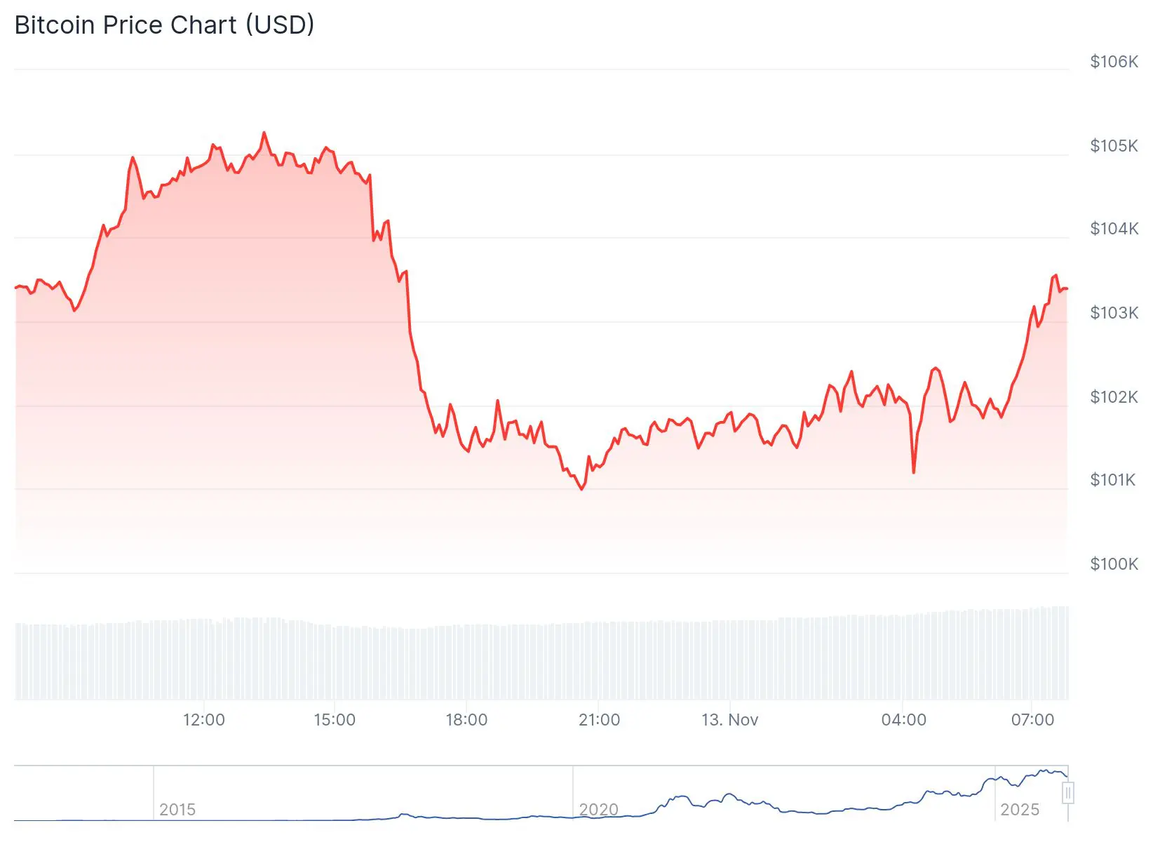 Iets na 15:00 uur zonk de koers als een baksteen. In twee uur tijd kelderde het met zo’n 3,5 procent, van 105.000 dollar tot 101.400 dollar. ‘s Avonds dook het zelfs nog kort onder de 101.000 dollar.
