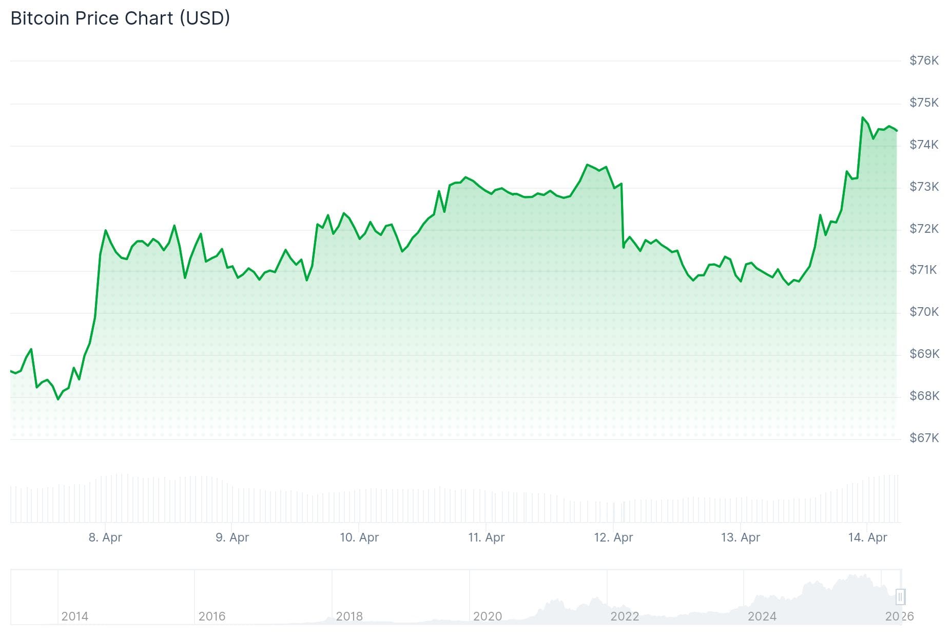 Bitcoin ging van minder dan 71.000 dollar naar 74.400 dollar. Aan het begin van de nacht werd een piek bereikt van bijna 74.900 dollar. Dat is de hoogst gemeten stand sinds 17 maart. Die dag werd de 76.000 dollar aangeraakt.