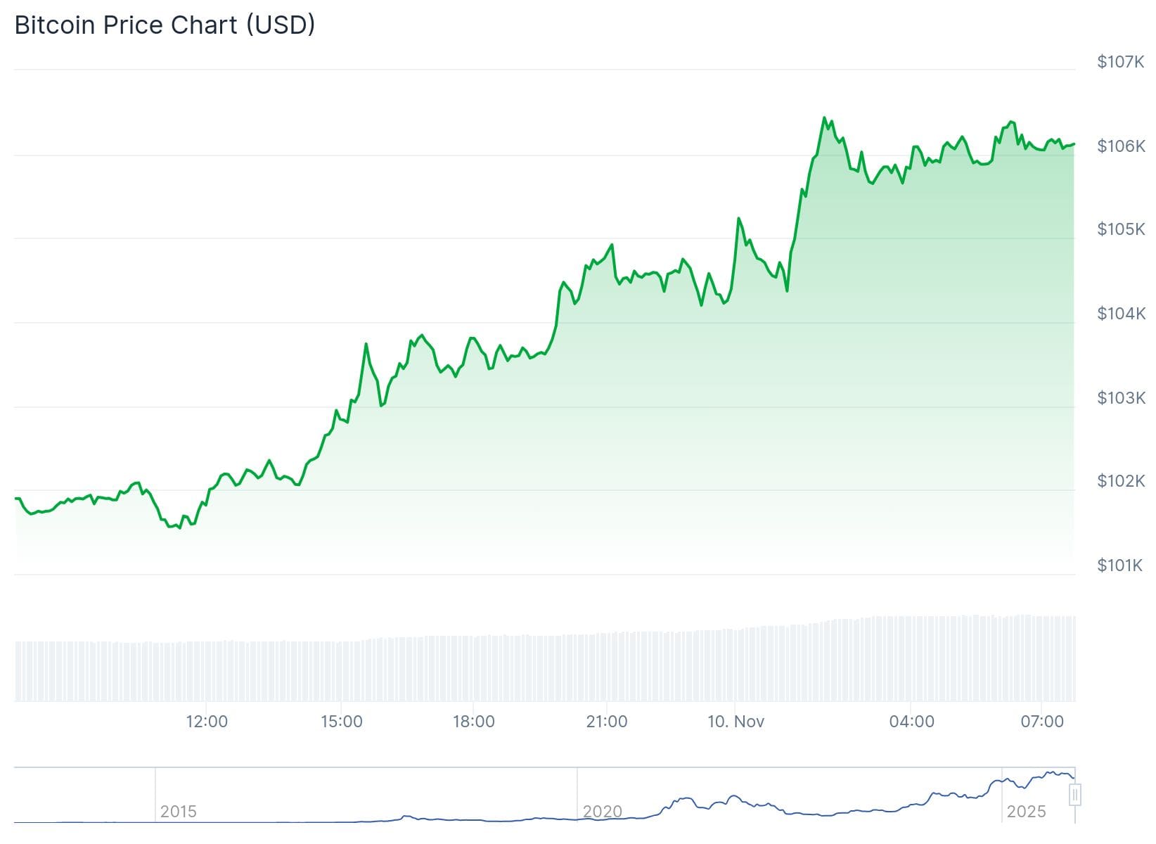 Gisteren in de ochtend werd er nog minder dan 102.000 dollar betaald voor de grootste cryptomunt, maar sinds het begin van de nacht is dat opgelopen tot meer dan 106.000 dollar.