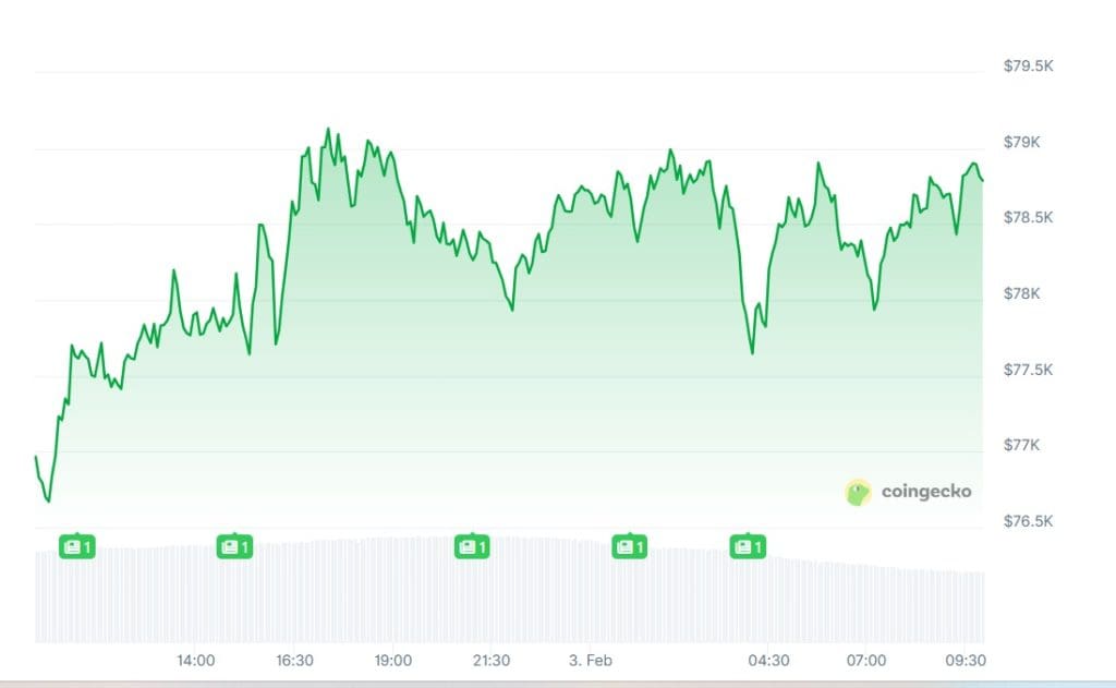 75.000 dollar bleek een keerpunt. Vanaf daar kwam de koers weer tot leven en liep die vrijwel aan één stuk door op tot circa 79.230 dollar, een stijging van ruim 6 procent. Op het moment van schrijven staat BTC op een koers van 78,809 dollar.