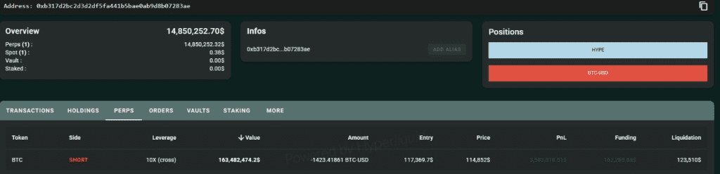 Nu lijkt de trader hetzelfde patroon te volgen. Volgens on-chaindata van handelsplatform Hyperliquid staat de nieuwe positie al zo’n 3,5 miljoen dollar in de plus. De short wordt automatisch geliquideerd als de bitcoinprijs boven 123.500 dollar uitstijgt.