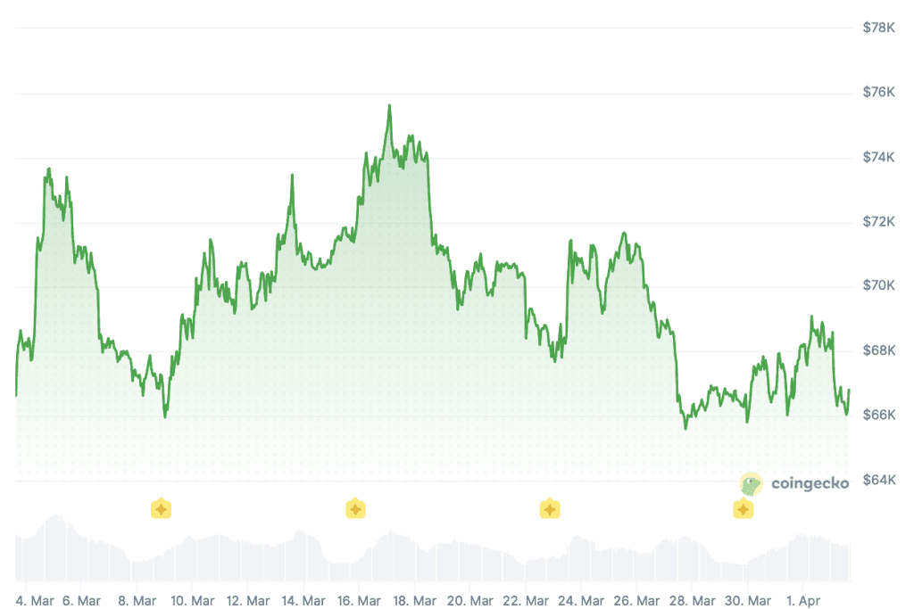 Sinds het uitbreken van het conflict, reageerde de cryptomarkt eerst volatiel maar daarna redelijk stabiel. Bitcoin daalde initieel naar 62.000 dollar en krabbelde daarna weer terug omhoog naar 76.000 dollar. Sindsdien schommelt de koers daartussen.