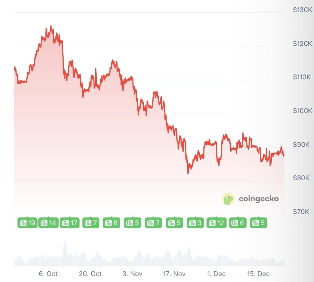 Bitcoin is gisteren in minder dan acht uur tijd met 3 procent gedaald. De koers bereikte vanochtend een dieptepunt rond 87.000 dollar, maar inmiddels is de munt 87.770 dollar waard.