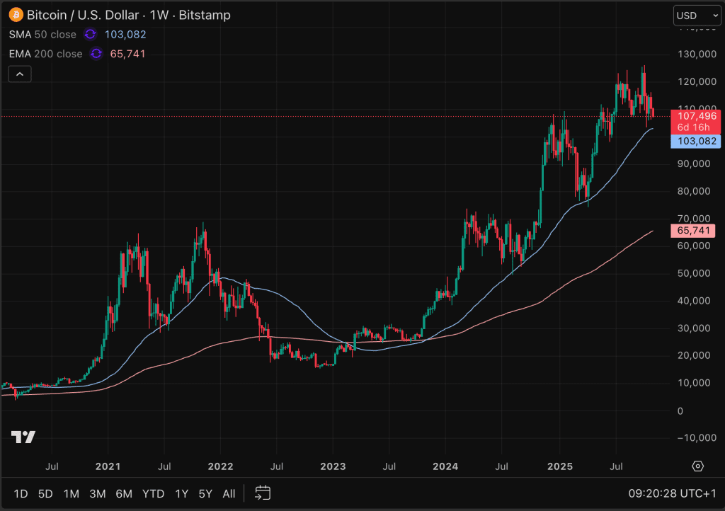 Voorlopig is het dus belangrijk dat bitcoin de steun op 107.000 dollar kan vasthouden, en dat de koers niet onder het 50-weekse gemiddelde sluit. Blijft daarvan sprake, dan is er in ieder geval nog hoop op één periode van scherpe stijgingen voor de digitale munt.