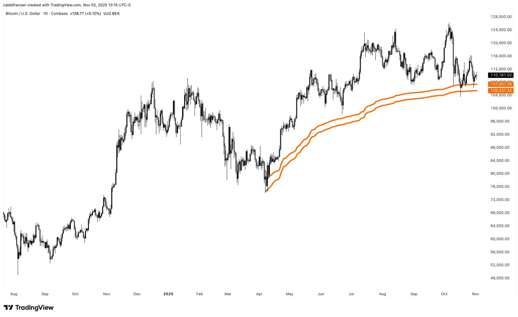 In de grafiek hieronder zien we hoe bitcoin steun krijgt van de gemiddelde, op handelsvolume gewogen koers (AVWAP) sinds april 2025.