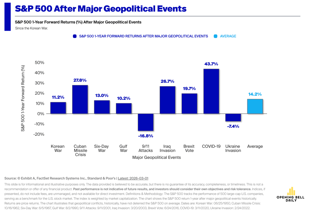 Ook de bredere aandelenmarkt laat geen paniek zien. Historisch gezien staan Amerikaanse aandelen gemiddeld ruim 14 procent hoger in de twaalf maanden na grote geopolitieke schokken sinds 1950.