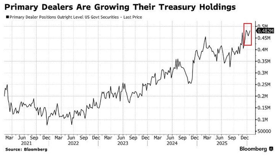 De tweede grafiek kijkt naar de balans van primary dealers, de financiële tussenpersonen die nieuwe Amerikaanse staatsobligaties tijdelijk opvangen.