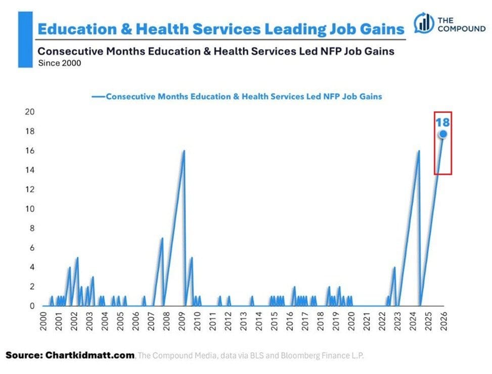 De derde grafiek laat zien dat nieuwe banen steeds vaker uit defensieve sectoren zoals zorg en onderwijs komen. Dat zijn sectoren die blijven groeien door demografie en publieke financiering, zelfs wanneer de bredere economie vertraagt.