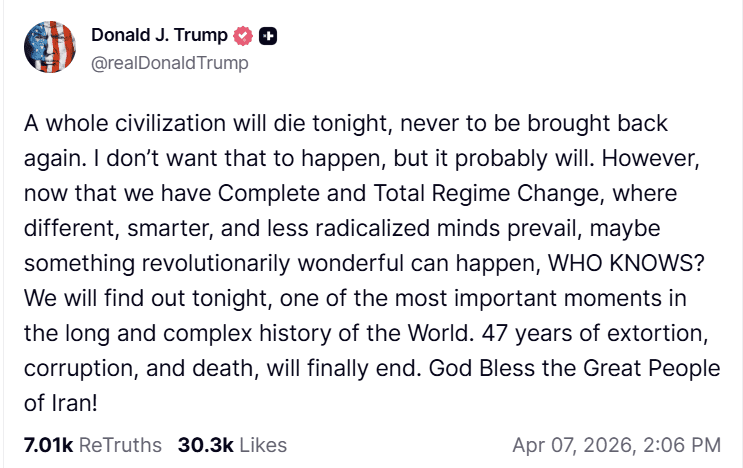 Op zijn platform Truth Social schreef Trump vanmiddag: “Een hele beschaving zal vannacht sterven, om nooit meer terug te komen. Ik wil niet dat dat gebeurt, maar het zal waarschijnlijk wel gebeuren.”.