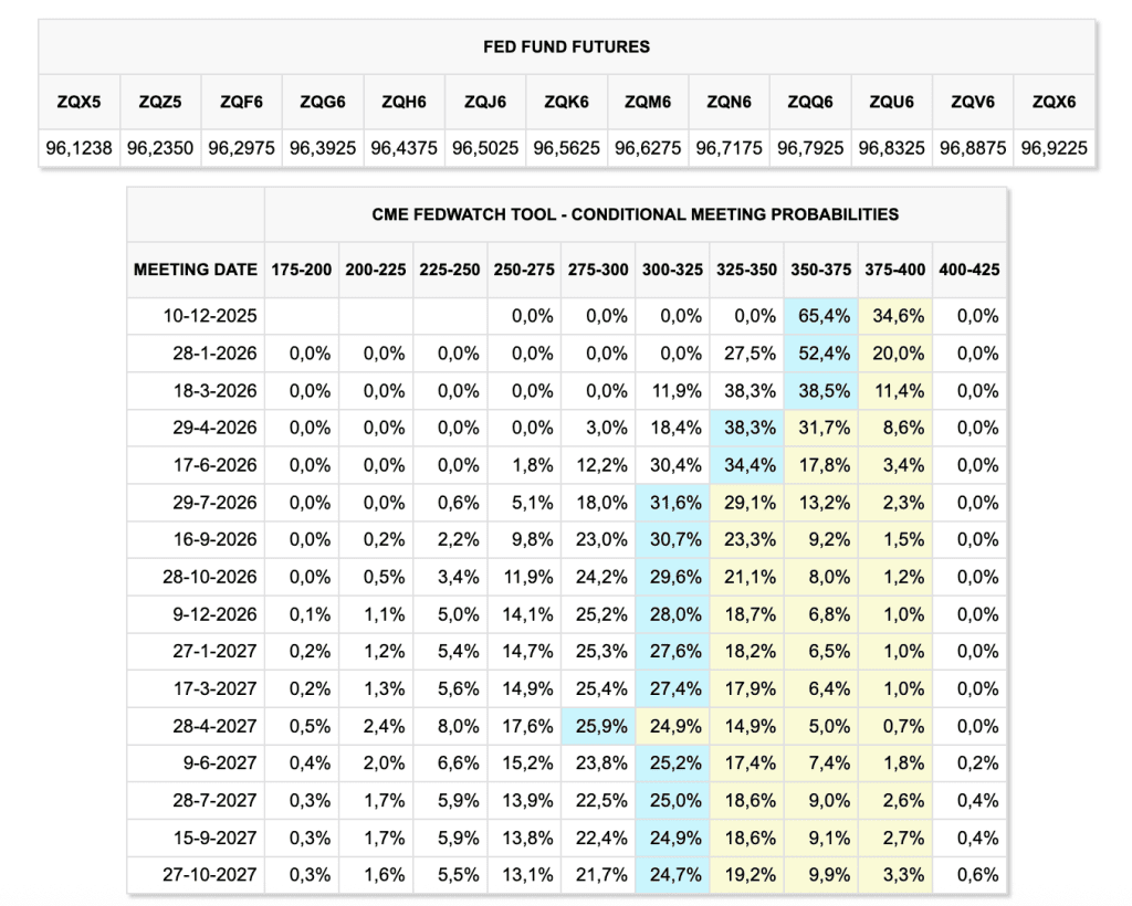 Voorlopig ziet de markt nog altijd een kans van 65,4 procent voor een renteverlaging in december. Het risico voor bitcoin is dat de Amerikaanse centrale bank tóch besluit om een pauze in te lassen in december, en we plotseling geen renteverlaging krijgen.