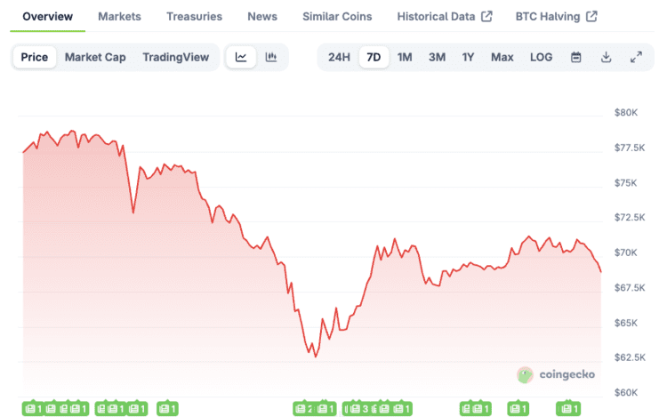 Sinds de piek in oktober rond 126000, daalde bitcoin hard en zakte vorige week zelfs tot ongeveer 60.000 dollar. De prijs ligt momenteel rond 68.750 dollar.