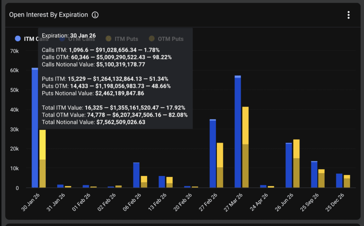 Vandaag bereiken veel van deze opties die einddatum. De opties op Deribit vertegenwoordigen samen een waarde van ongeveer 6,9 miljard euro. Dit cijfer is gebaseerd op data van Deribit zelf. Dat platform verwerkt het grootste deel van de bitcoin opties en is goed voor ongeveer 80 procent van alle contracten. Daardoor geeft deze data een representatief beeld van de afloop vandaag.