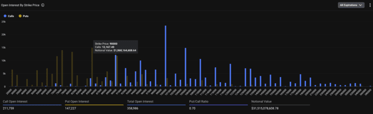 Volgens data van Deribit ligt het meeste openstaande volume bij bitcoin opties rond de grens van 90.000 dollar. Dit niveau springt eruit omdat daar veel contracten samenkomen en de koers rond dit punt beweegt.