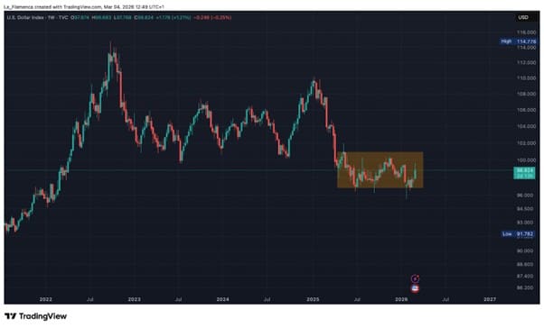 Nu de dollar sterker wordt, kan dat het tegenovergestelde effect op bitcoin hebben. Toch is er nog geen sprake van een duidelijke opwaartse trend in de dollar index. De koers verkeert sinds april vorig jaar al in een consolidatieface, waarin er vooral zijwaartse prijsbewegingen zichtbaar zijn.