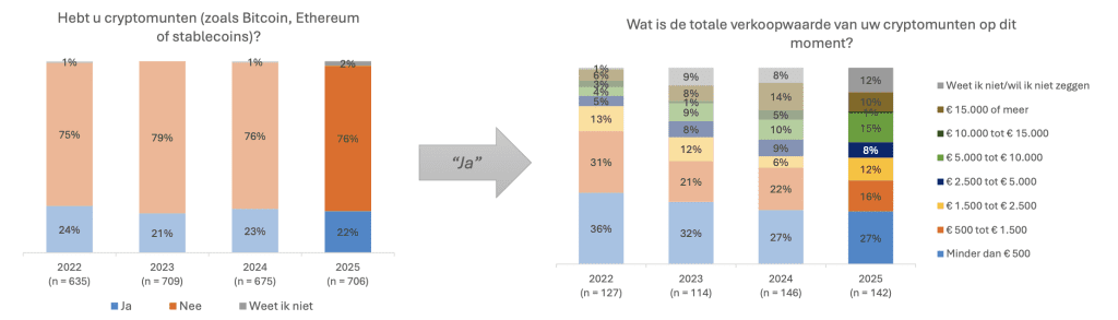 Volgens een enquête van de financiële toezichthouder investeerden aanzienlijk meer mensen in 2024 en 2025 in beleggingsproducten op basis van crypto, dan in 2022 en 2023. Inmiddels zou één op de tien beleggers er in investeren, terwijl dat in 2022 nog één op de honderd was. Daarmee is de populariteit in enkele jaren vertienvoudigd.