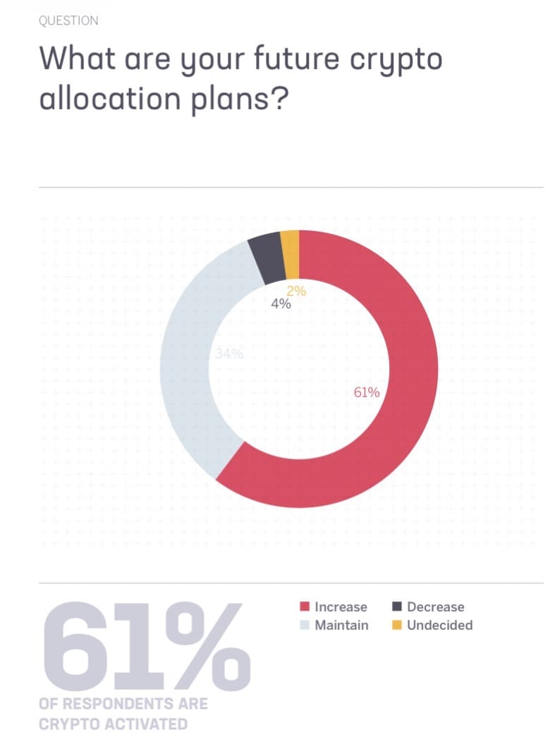 47 procent van de investeerders die nu nog geen crypto bezitten geven aan ergens in het komende jaar te zullen gaan investeren. 61 procent van de respondenten met crypto geeft aan het plan te hebben om meer te gaan investeren. 38 procent is van plan om dat dit jaar nog te doen.