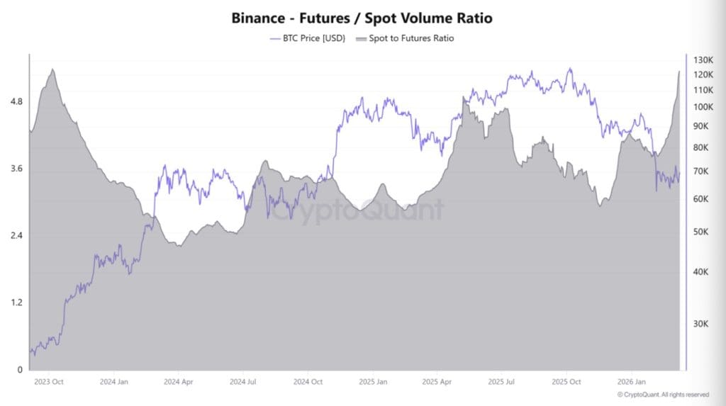 Analist Maartunn deelt op CryptoQuant dat een index die futures-handel vergelijkt met gewone spot-handel tot het hoogste punt in drie jaar tijd is gestegen. Momenteel is het handelsvolume op de futures-markt namelijk ruim vijf keer zo groot.