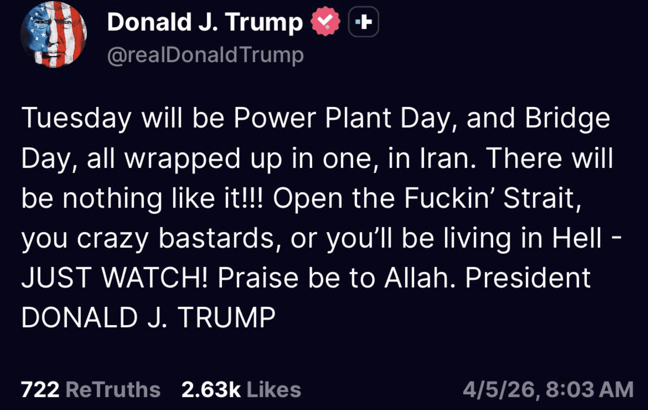 In de vroege (Amerikaanse) ochtend van zondag 5 april slingerde Trump een bericht de wereld in dat weinig ruimte laat voor interpretatie. In zijn kenmerkende stijl waarschuwt hij Iran dat dinsdag de boeken in zal gaan als “Power Plant Day” en “Bridge Day”. De dreiging is een direct gevolg van de voortdurende blokkade van de Straat van Hormuz, een cruciale ader voor de wereldwijde olie- en gastoevoer die al weken nagenoeg stilligt.