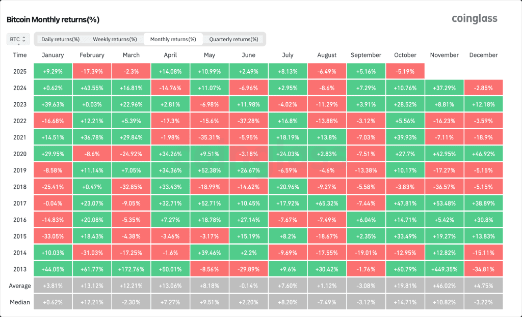 Met oktober achter de rug, blikt men nu vooruit op november. Ook daarover is historische data beschikbaar. Zo was november volgens gegevens van Coinglass meestal een groene maand, met uitzondering van vier jaren.