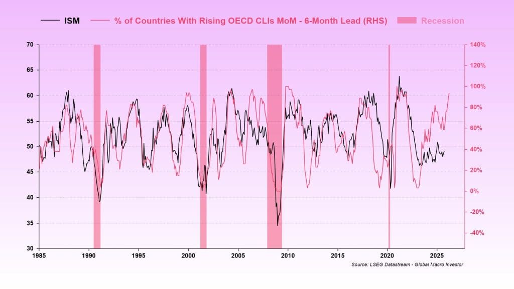 In de eerste grafiek zien we dat de Composite Leading Indicators in bijna 100 procent van de landen stijgen. De rode lijn toont deze ontwikkeling.