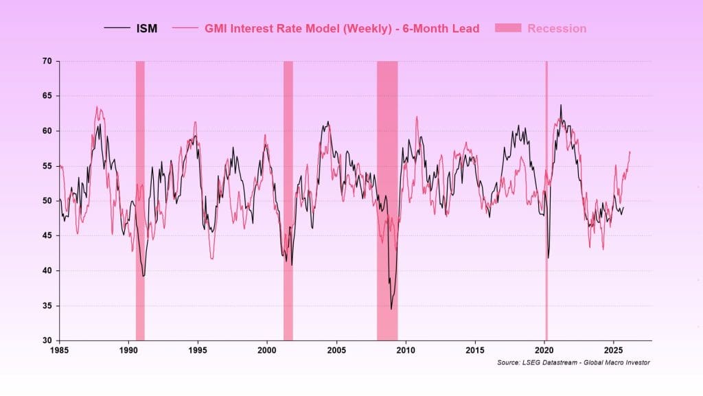 De tweede indicator is het GMI Interest Rate Model. Ook deze stijgt, wat erop wijst dat de economische cyclus aantrekt en dat de verwachtingen voor groei en inflatie toenemen.