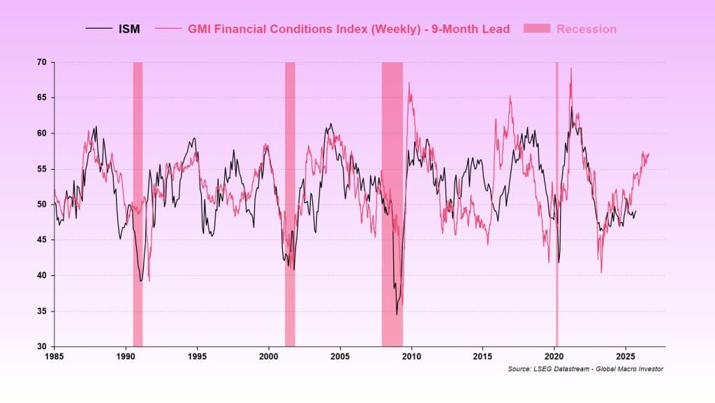 Als laatste zien we de GMI Financial Conditions Index. Deze indicator meet hoe soepel of krap de financiële omstandigheden zijn, op basis van factoren zoals kredietkosten, rente en liquiditeit.