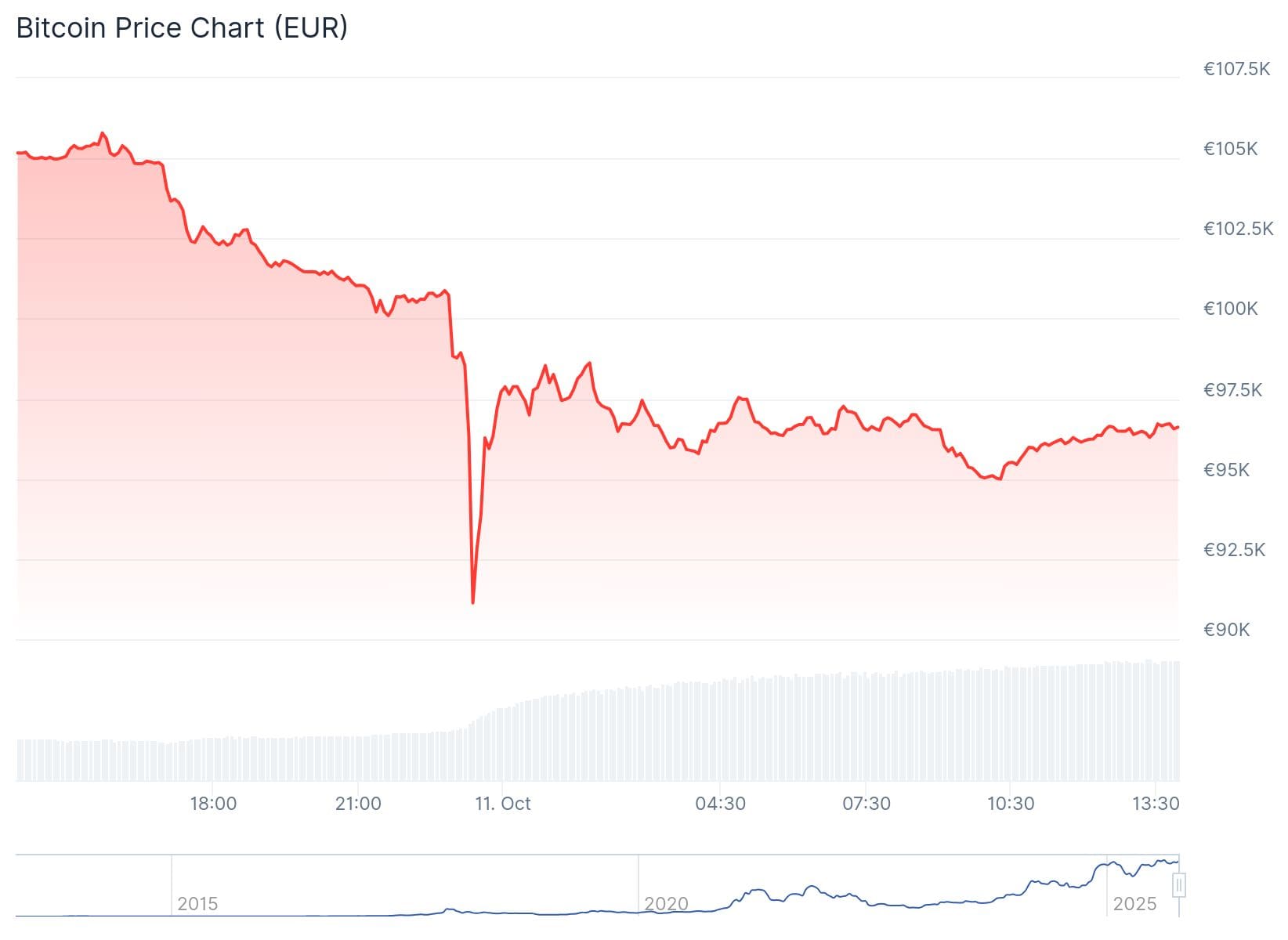 Aan het einde van de middag ramde Trump de markt het ravijn in. Op socialmedia dreigde hij met ‘’zware verhogingen’’ van importtarieven op Chinese producten. Zijn boze bericht volgde op de aankondiging van China om de export van zeldzame aardmetalen op te schorten. Bitcoin daalde in een paar uur tijd van ongeveer 105.000 euro naar 100.000 euro. Maar dat was pas de eerste klap.