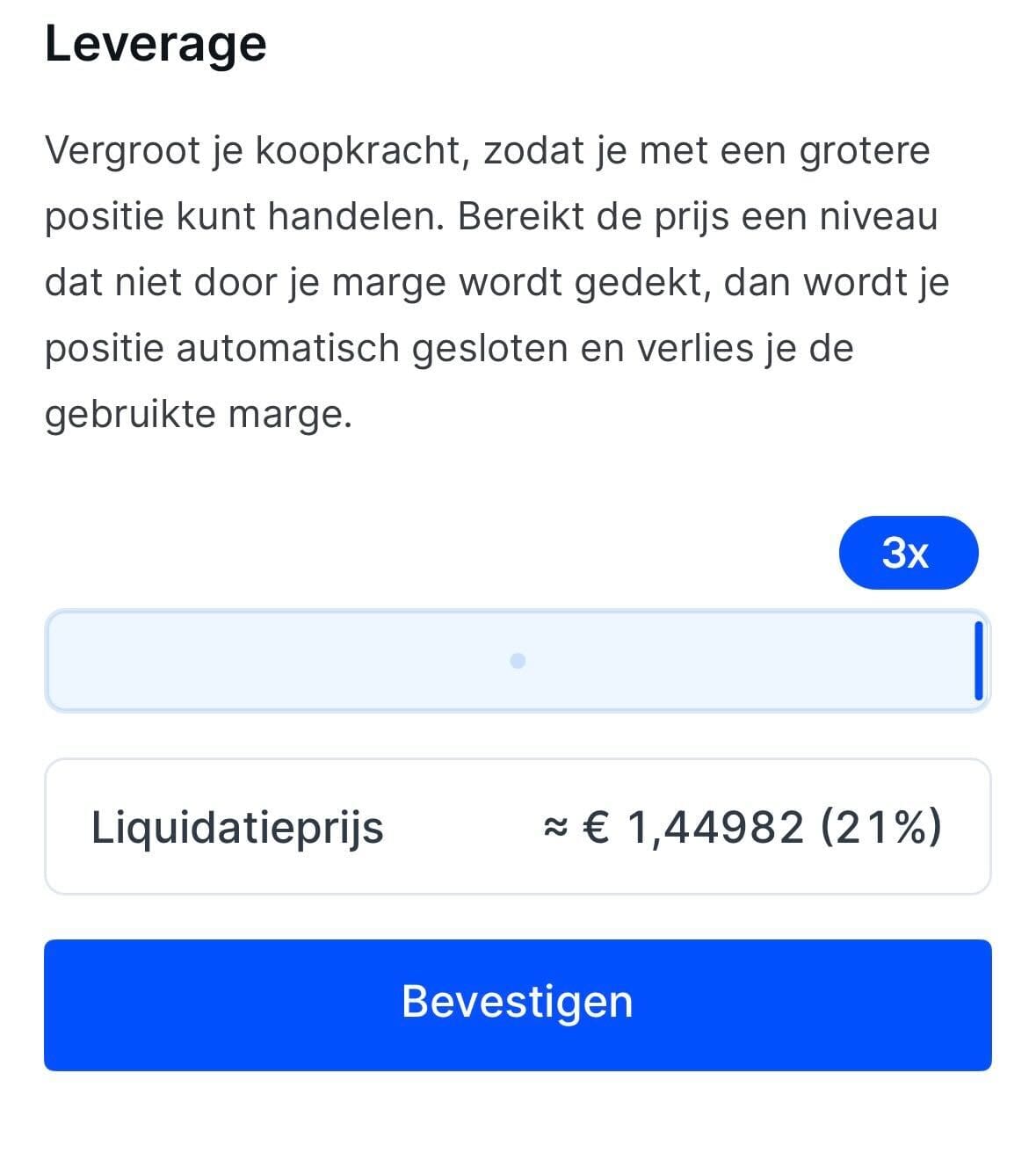 Gaat de koers de kant op die jij verwacht, dan kan je winst sneller oplopen. Bij x2 of x3 gaat dat namelijk twee tot drie keer zo hard. In een markt zoals crypto, waar prijzen snel bewegen, kan dat in korte tijd een groot verschil maken.