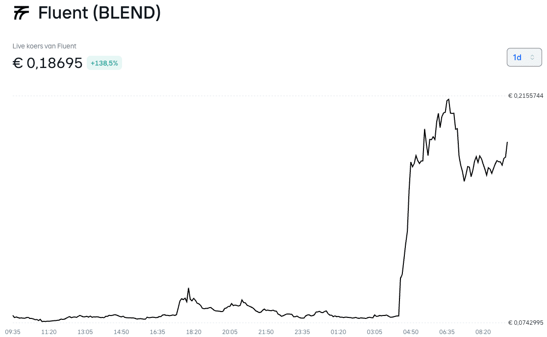 Ook fluent (BLEND) doet het goed. De munt steeg in korte tijd van 0,075 euro naar 0,215 euro, een stijging van iets meer dan 200 procent.