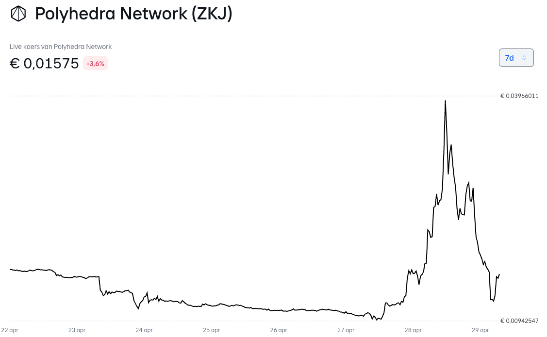 Wat extra opvalt: ZKJ was zelfs de meest verhandelde munt op Bitvavo, blijkt uit de dagelijkse handelsdata van het platform. Daarmee liet het bitcoin en XRP achter zich. Inmiddels is de koers alweer flink teruggezakt naar ongeveer 0,015 euro. Bekijk hier de actuele koersgrafiek van ZKJ.
