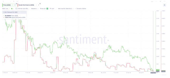 Het zwakke sentiment is ook zichtbaar in de online aandacht voor Cardano. Analyseplatform Santiment meet dit met zogeheten social dominance. Dat laat zien hoeveel er online over een munt wordt gesproken vergeleken met andere crypto.