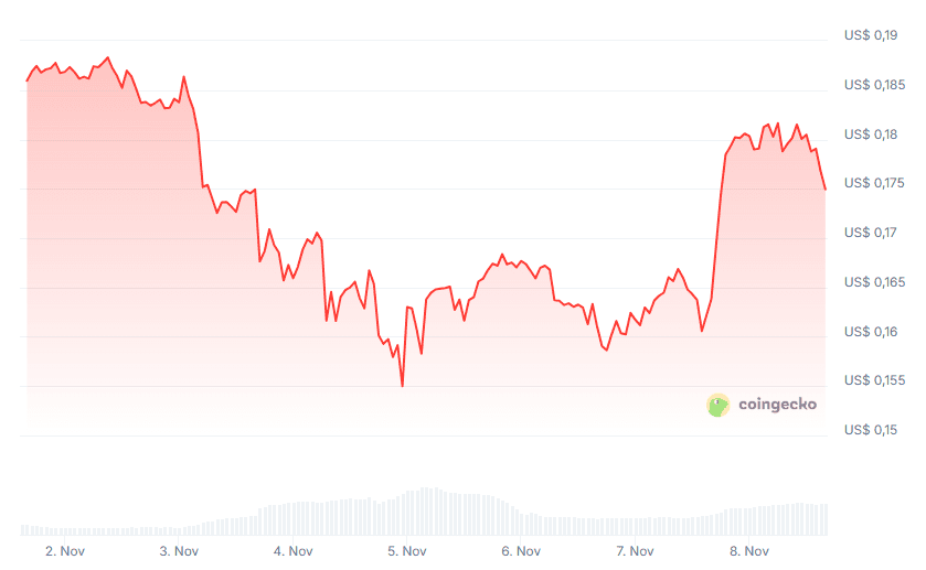 De stijging volgt na een zware week voor de altcoin. Op maandagnacht stond de prijs per token nog op 0,186 dollar, voordat het volledig in elkaar stortte en pas een bodem vond op 0,155 dollar. Door de daling van 16,6 procent, had de munt flink wat goed te maken. De recente rally heeft hier een degelijke bijdrage in geleverd.