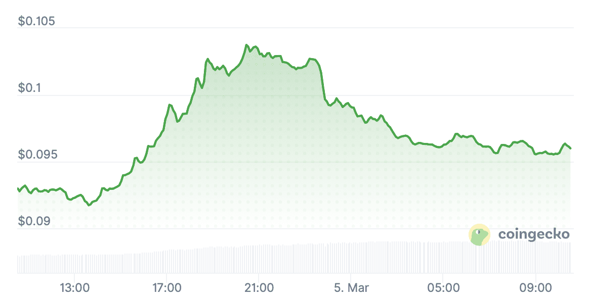 Vandaag is de koers echter weer wat aan het dalen en op het moment van schrijven is de munt 0,096 dollar waard.
