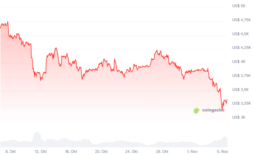 De koers van ethereum bevindt zich deze maand in een neerwaartse trend. Waar deze op 6 oktober nog op 4.600 dollar stond is deze inmiddels gezakt naar het huidige niveau van 3.363 dollar, ruim 1.200 dollar lager. Dit komt neer op een daling van 27 procent in slechts een maand tijd.