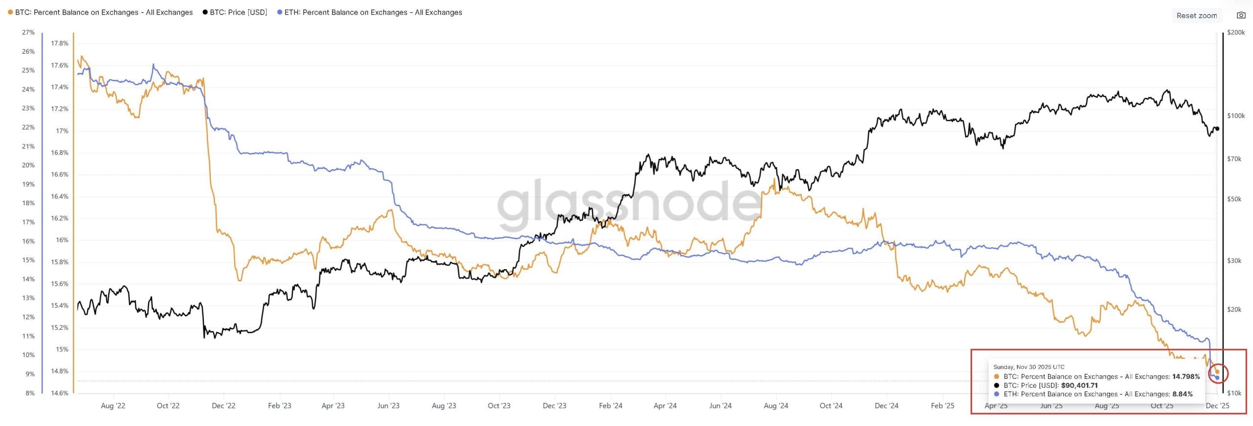 Volgens gegevens van Glassnode bezitten cryptobeurzen nu minder dan 9 procent van het totale circulerende aanbod.